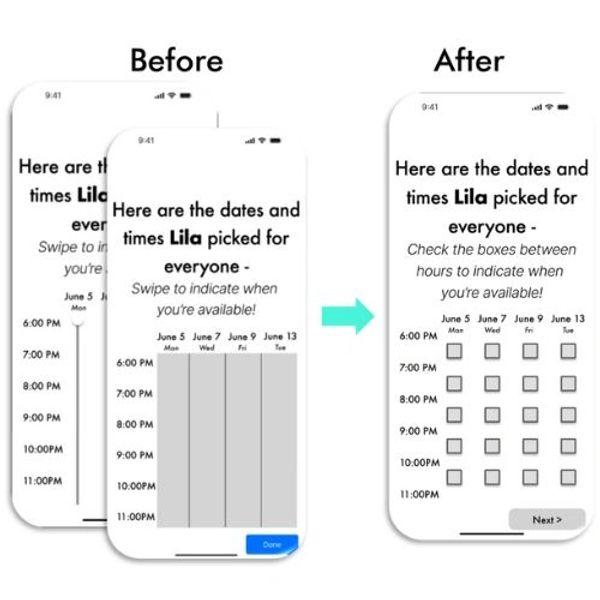 Before, users could not see a second dot (background before) that would allow them to place a time range of their availability. In the second design iteration (foreground before), users were hesitant to physically touch and drag on the screen to populate a range of availability.