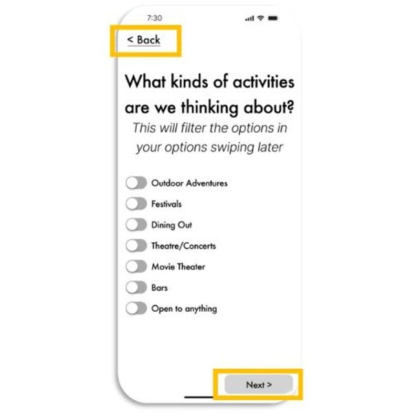 Something that should have been very obvious from the beginning was the need for navigational buttons. Users would get past the screen of additional considerations (diet, cost, religious, etc), and remember they forgot to include a consideration. They would try to go back, but I had not made a way for the user to edit previous screen selections. This was a quick and easy fix, again staying true to my focus on mobile platform neutrality.