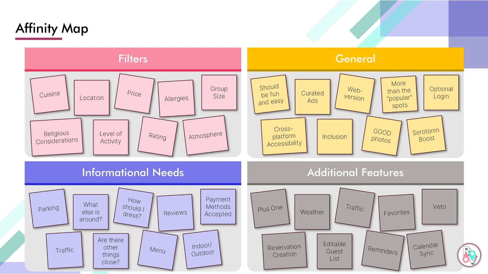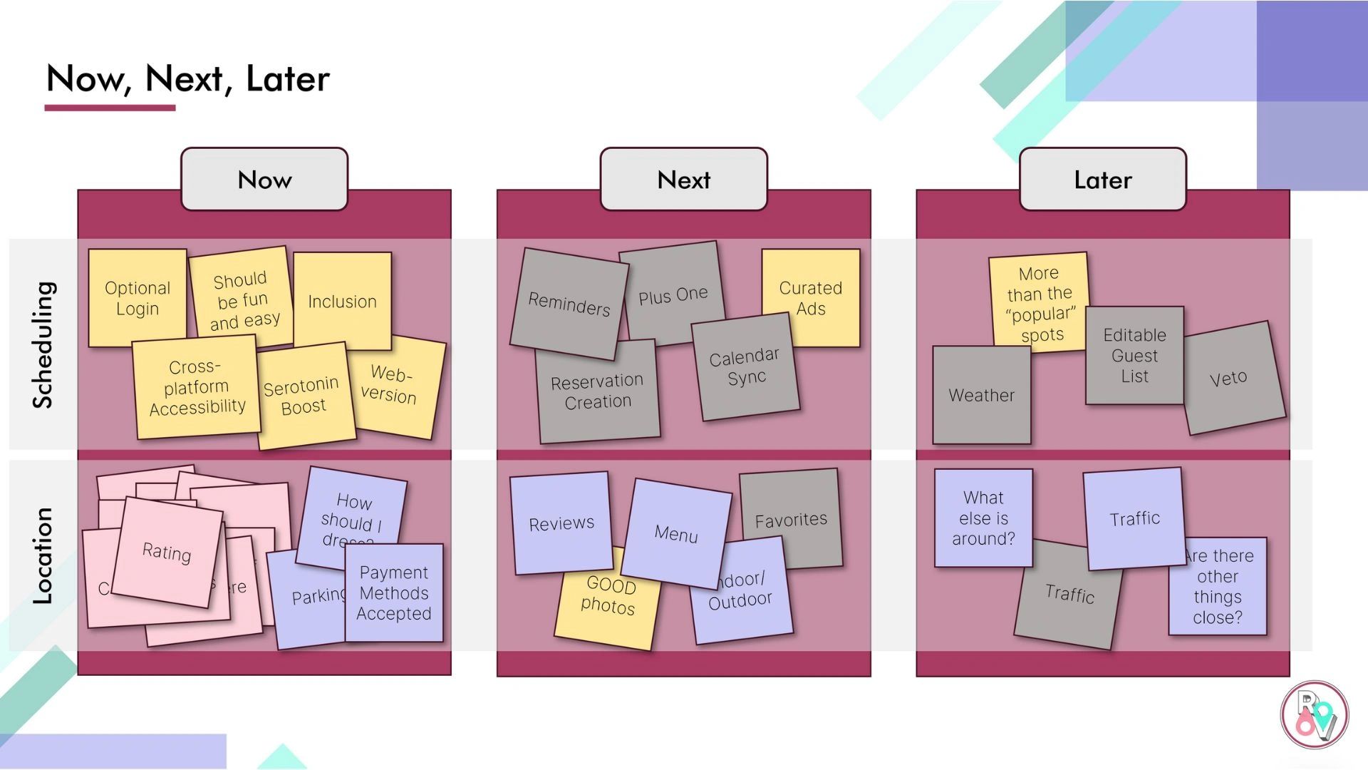 With all information gathered from interviews, I was able to organize all suggested features into an Affinity Map which informed what was necessary for groundwork of the app. The features that came out of interviews were so robust, they needed to also be organized into a Now/Next/Later chart to inform the MVP for this project.