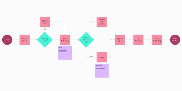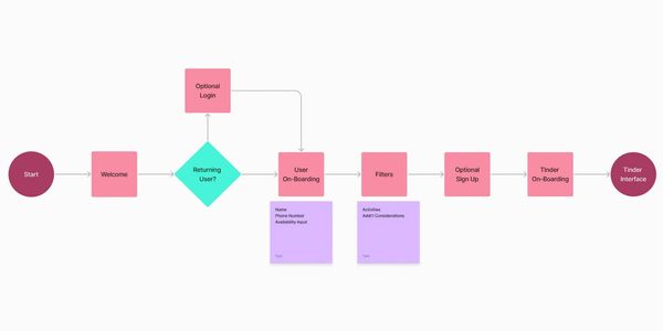 Return/Guest flow was fairly straightforward. The caveat to future-state build would be the guest user can skip inputting preferences if they have a profile/membership. This would cut upwards of 5 minutes of inputting information and bring the user to the swipe function.