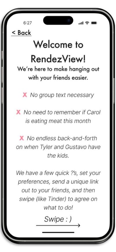 We all know and have likely been in the dreaded group text to try and organize dinner with more than 3 friends. It's a never-ending back-and-forth of when everyone is free, when can the couple with kids find a sitter, and what diet is Carol on this week? RendezView simplifies the scheduling and locating of a hang with your friends. No sign up required, guests and hosts alike can input any necessary considerations (i.e. - diet, level of effort, size of group), and through a swiping interface ensure everyone is accounted for and heard when agreeing on the location.