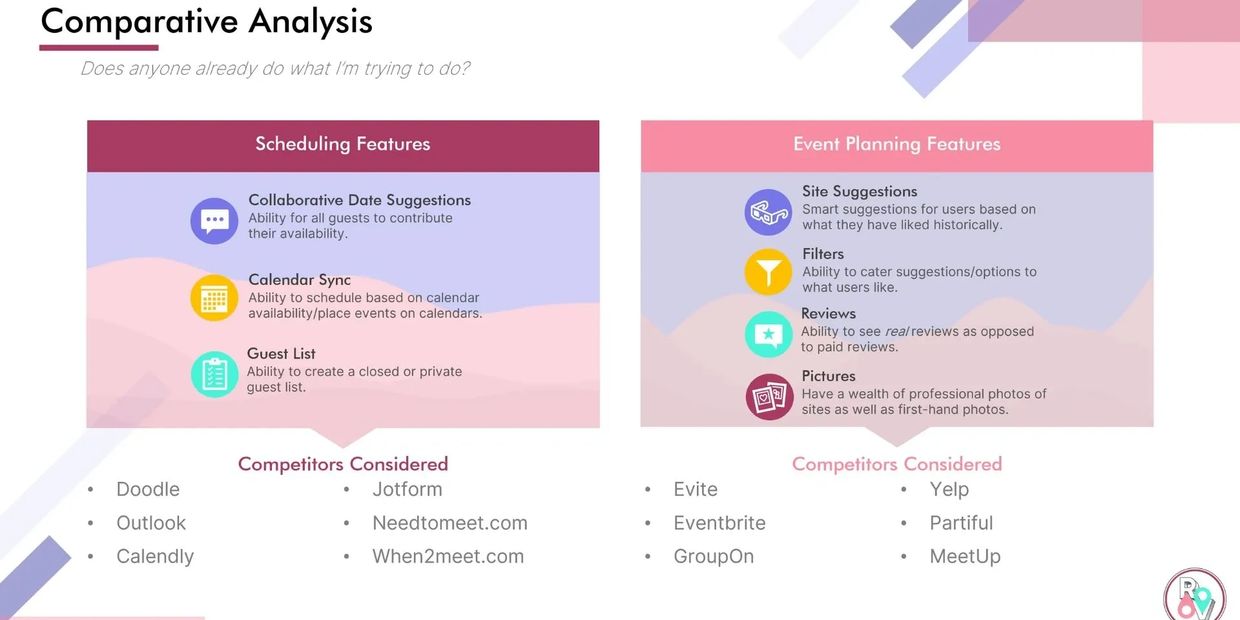 Through comparative analysis, it became clear that currently existing websites do not have cross-over in the features I was seeking for RendezView. My ideal outcome was to bridge the gap of scheduling applications, event planning/suggesting, and review sites. Of the 12 competitors I reviewed, 3 checked the most features, excited, and inspired me. These included when2meet.com, Partiful, and Yelp.