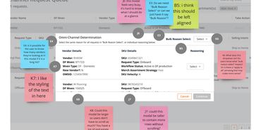 Users were very happy with the department dropdown functionality and the ability to search for specific SKUs in the top right. The action buttons in the bottom right require that any items selected are going to receive the same determination (approve, pause, reject). This function allows users to select any number of request types (more on this in the action modal section).